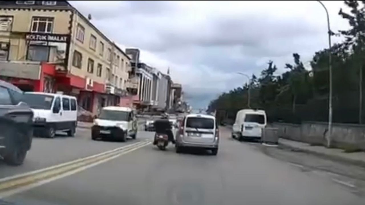 Motosikletli ile hafif ticari aracın sürücüsü arasında çıkan kavga başka bir sürücünün araç kamerasıyla kaydedildi. Görüntülerde, iki taraf arasında kavga çıkması ve motosikletlinin hafif ticari araca elindeki kaskla saldırdığı anlar yer aldı.