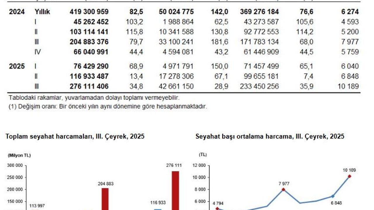 Yerli turistlerin, yurt içinde yaptıkları seyahat harcamaları 2025'in 3'üncü çeyreğinde bir önceki senenin aynı çeyreğine göre yüzde 34,8 artarak 276 milyar 111 milyon 406 bin TL olarak gerçekleşti. Bu harcamaların yüzde 84,5'ini 233 milyar 450 milyon 256 bin TL ile kişisel harcamalar olurken yüzde 15,5'ini ise 42 milyar 661 milyon 150 bin TL ile paket tur harcamaları oluşturdu. Seyahat başına yapılan ortalama harcama ise 10 bin 189 lira oldu.