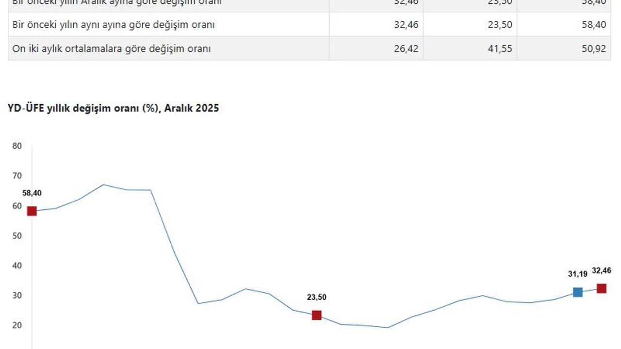 TÜİK, Aralık 2025 dönemine ilişkin yurt dışı üretici fiyat endeksi verilerini açıkladı. Buna göre; yurt dışı üretici fiyatları aralık ayında bir önceki aya göre yüzde 1,88, bir önceki yılın aynı ayına göre yüzde 32,46 ve 12 aylık ortalamalara göre yüzde 26,42 arttı.