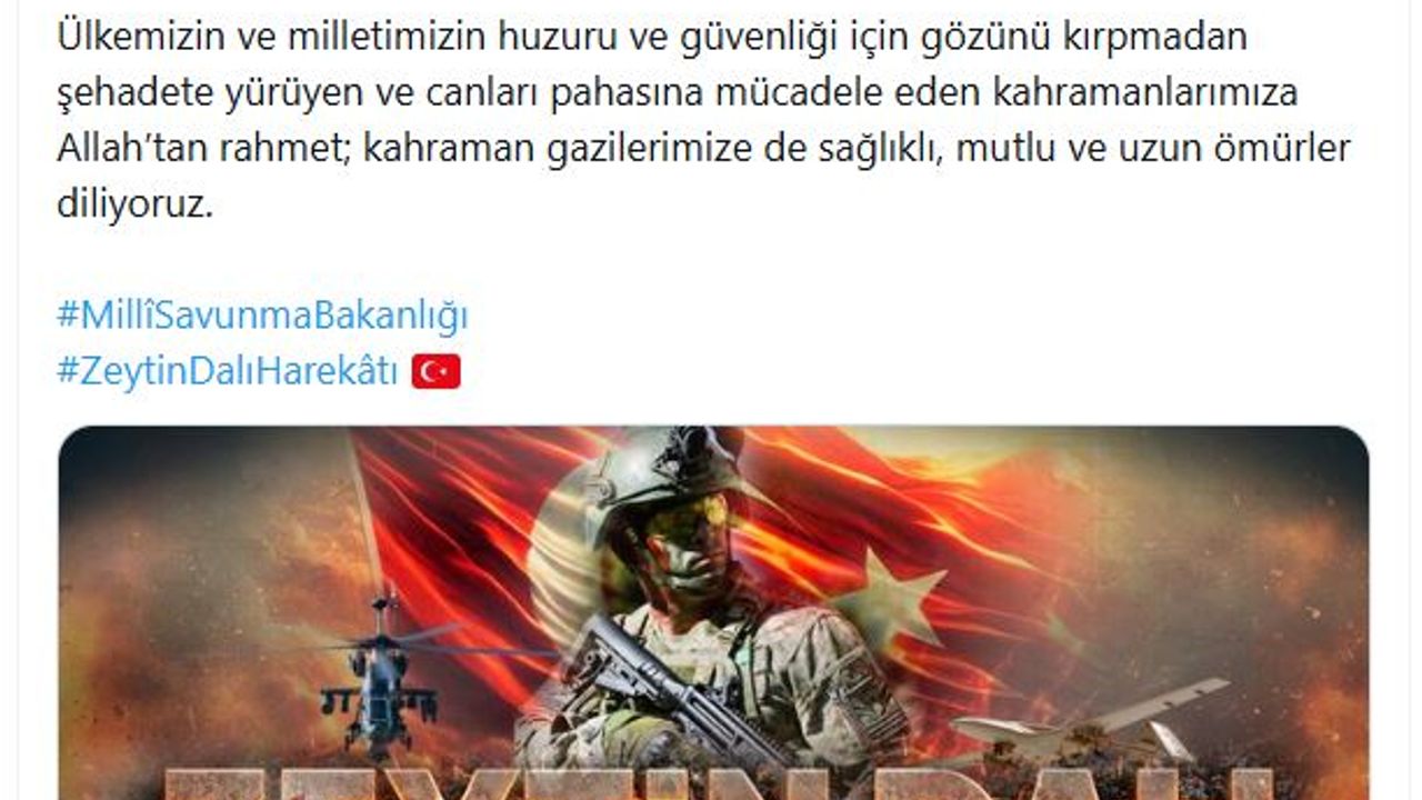 Bakanlığın sanal medya hesabından yapılan paylaşımda, 'Ülkemizin güneyinde oluşturulmak istenen terör koridorunu paramparça eden, hudutlarımız ile masum bölge halkının güvenliğini sağlayan Zeytin Dalı Harekatı'nın 8'inci yıl dönümünde; harekatı başarıyla icra eden Türk Silahlı Kuvvetlerimizi ve kahraman personelini gönülden selamlıyoruz. Ülkemizin ve milletimizin huzuru ve güvenliği için gözünü kırpmadan şehadete yürüyen ve canları pahasına mücadele eden kahramanlarımıza Allah'tan rahmet; kahraman gazilerimize de sağlıklı, mutlu ve uzun ömürler diliyoruz' denildi.